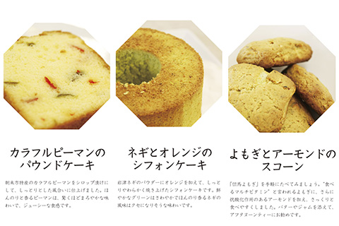 朝来市の特産である「岩津ネギ」「米」「ブルーベリー」「よもぎ」「ピーマン」を使用したスイーツを開発し、